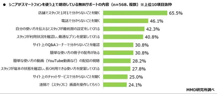 MMD研究所による調査によると、シニアのスマホ契約は78.9%が「店頭」で行われており、特にスタッフのサポートが手厚いキャリアショップが選ばれています。期待する無料サポートの内容としては、「店舗でスタッフと1対1でわからない点を質問できる」が65.5%と最多でした。