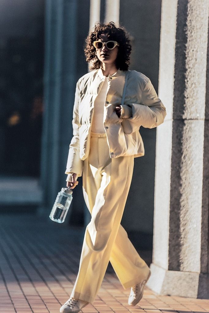 きちんと見えるスラックスと合わせて、ジャケットのようにさらっとハンサム。丈の短さを生かしたタックインで、着ぶくれしがちなダウンでも簡単に脚長バランスを構築。