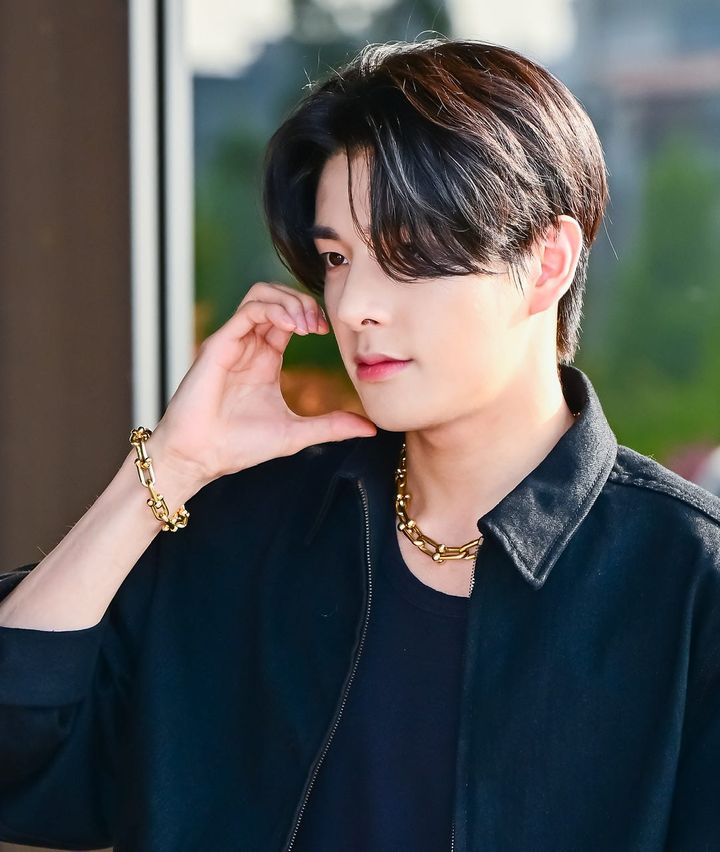 長めの前髪とグレーのカラーコンタクトによって、ミステリアスで神秘的なまなざしを叶えたソヌ。グレイッシュな淡いピンクリップが透明感をさらに後押し。