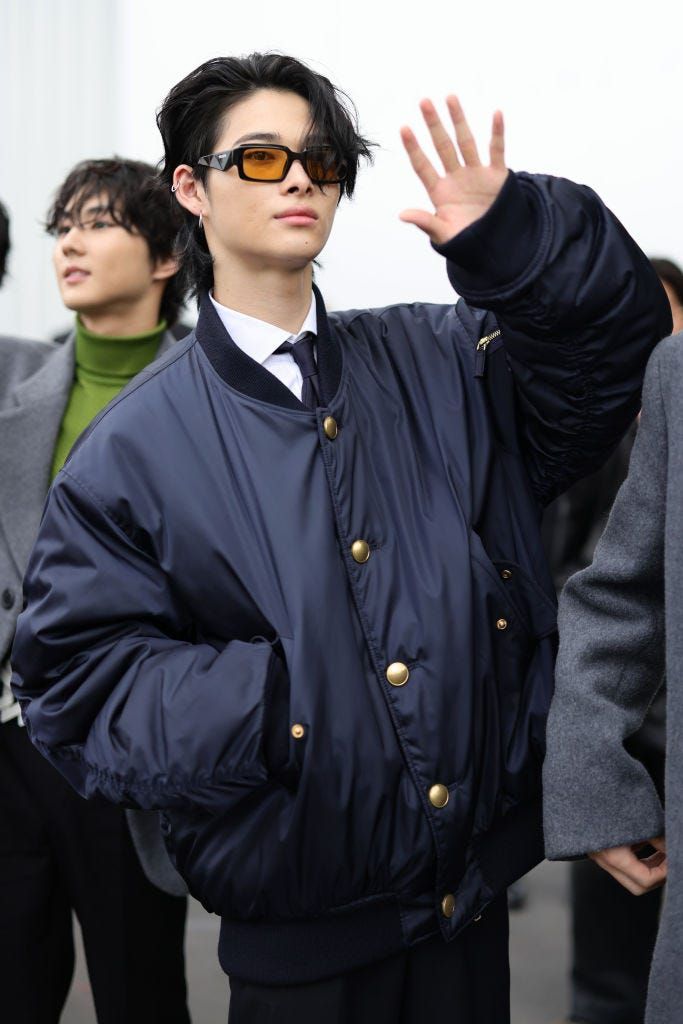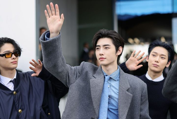 「プラダ」のコレクション会場に集まったファンに向かって手を振るソンフン。後ろに向かって流したエレガントなヘアが貴公子のようなビジュアルとベストマッチ。