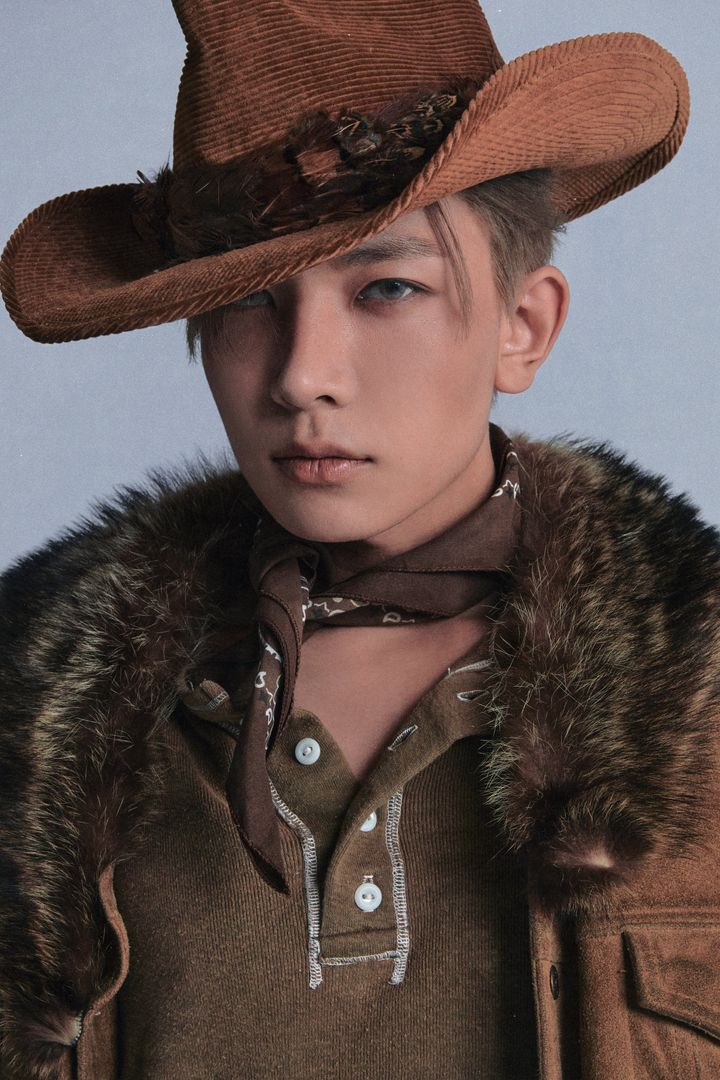 7thミニアルバム『THE SIN : VANISH』でカウボーイスタイルに挑戦したヒスン。髪もアイブロウもアッシュカラーで統一し、メイクは低彩度に抑えて冷ややかなムードをまとったカウボーイ像が新鮮。リップはあえて縦ジワを強調し、ダークカラーを忍ばせることで、退廃的なムードを引き出して。
