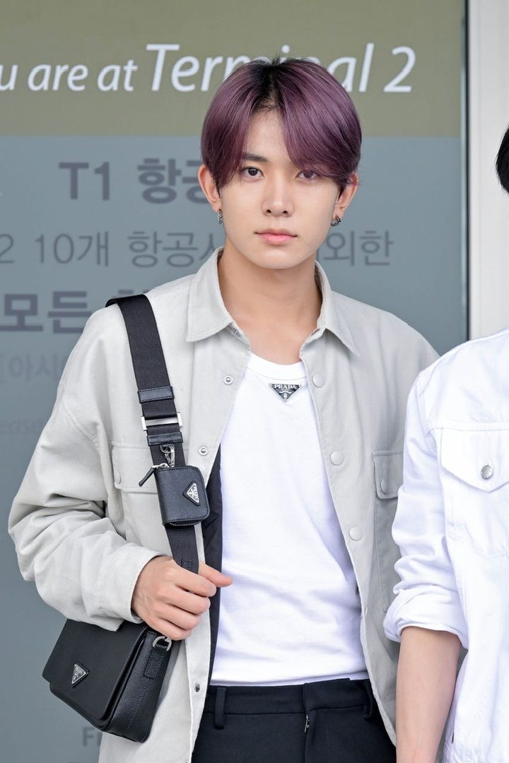 今夏、パープルヘアにTRYしたヒスン。ノーセットかのようなサラツヤヘア&ナチュラルメイクで「プラダ」のショーに向けて出国。