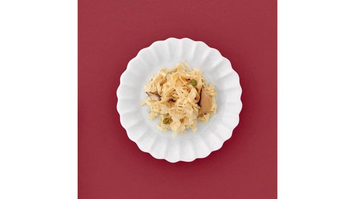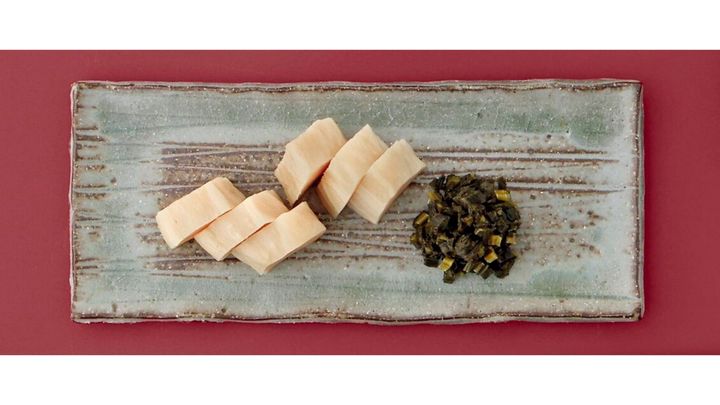 霜降さんが「ほのかな甘みとなめらかな舌触りが絶品」と称する薄い湯葉を刻み、ちりめんじゃこや干し椎茸、実山椒と合わせて昆布と鰹節の出汁で炊き上げた贅沢な一品。日々わずかに異なるちりめんの塩味に応じて、出汁を調整しています。「ご飯のおかずに最適!」と渡辺さん。