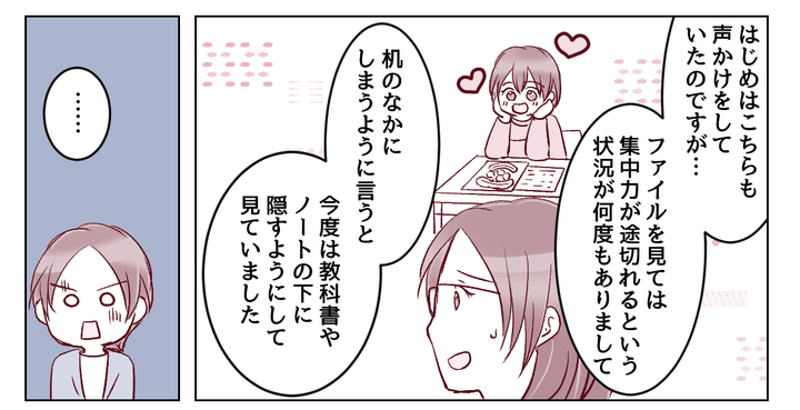 問題を解く時間に、ファイルをじっと眺めていた? しかも注意されても隠すようにして見ていた? 私は先生から聞かされた話にアゼンとしました。その状況が事実であれば、ミユが訴えていたこととはまるで印象が違います。