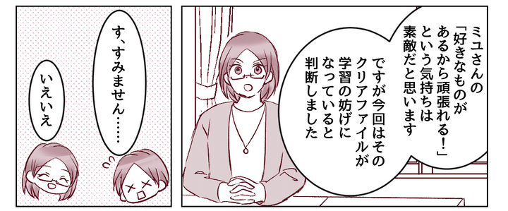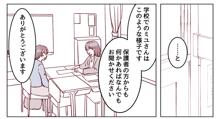 自分の思い込みで抗議するようなことをしなくて、本当によかった……。私はそう思いながら、ミユの態度を先生に謝罪したのでした。