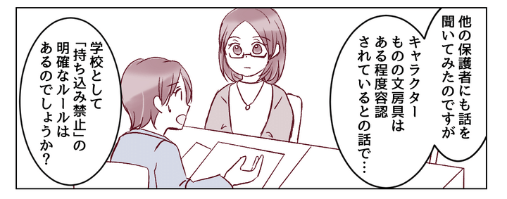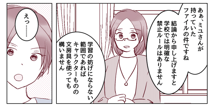 私はマリコ。ひとり娘のミユは小学5年生です。ある日、ミユが泣きながら帰宅してきました。どうやら推しVtuberがプリントされたクリアファイルを、先生から持ってくるなと言われたようなのです。ただママ友に確認してみたら「キャラクターものの文具は、ルール上問題ないはず」とのことでした。他の子は別に注意されていないのに、ミユの推しだけダメだなんて……。腑に落ちない私は、翌月の個人面談で担任の先生に確認してみることにしました。