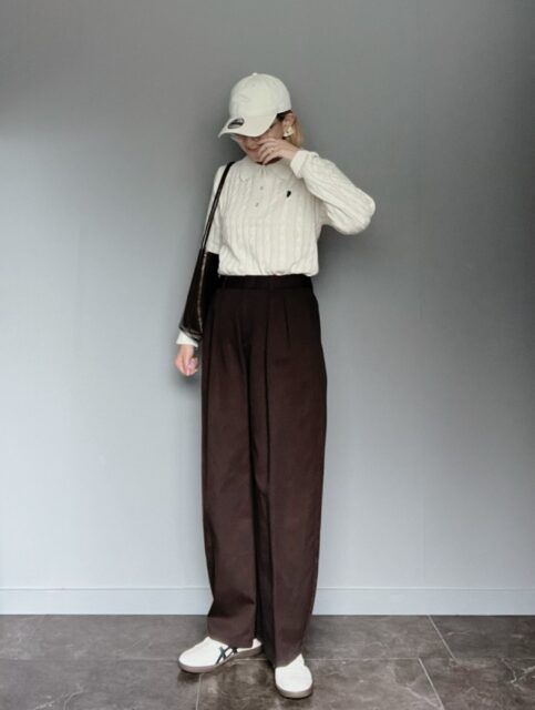 中でもスナップのようなケーブル編みのポロニットはプレッピースタイルに決まる一枚。ベーシックなワイドパンツに合わせるだけでコーデがサマになります。