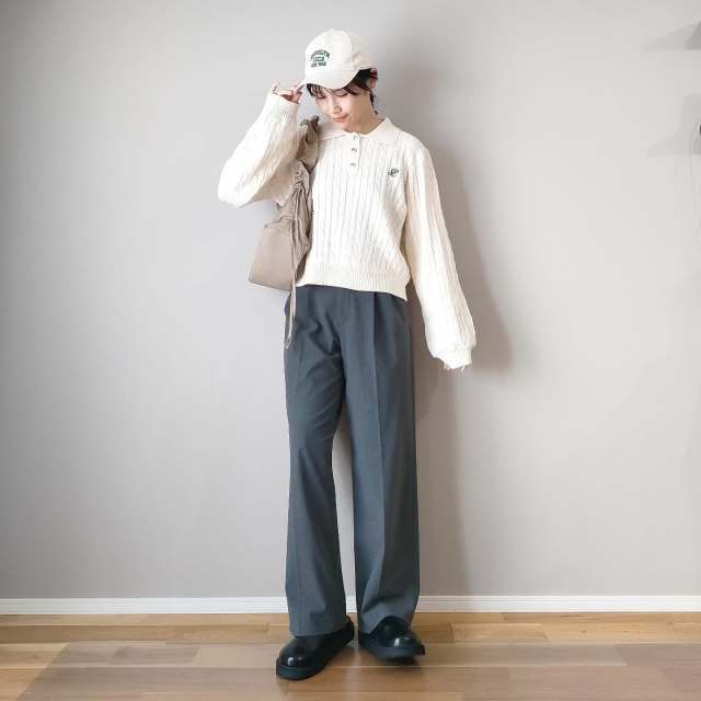 ポロ襟ニット×ワイドパンツのコーデ