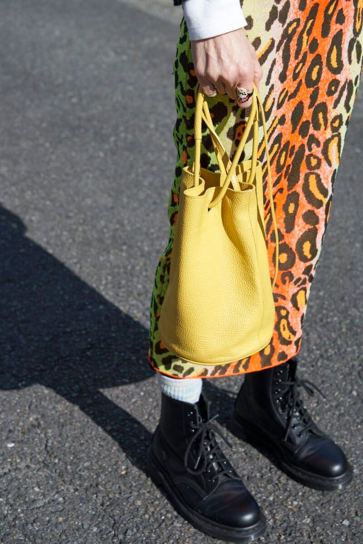 イエローのレザーバッグをアクセントに