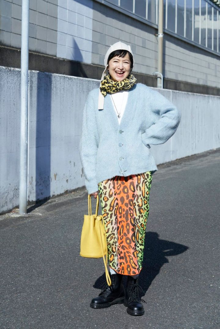 パッと目を惹くレオパード柄のスカートは、ステラマッカートニーのもの。「ご近所のセカンドハンドの店でひとめ惚れ。ウエストはゴムになっていて長時間はいていてもラクちんです」と藍田さん。アウターにオーバーサイズの古着のモヘアカーデを合わせると、ふんわりとやさしい雰囲気をまといます。