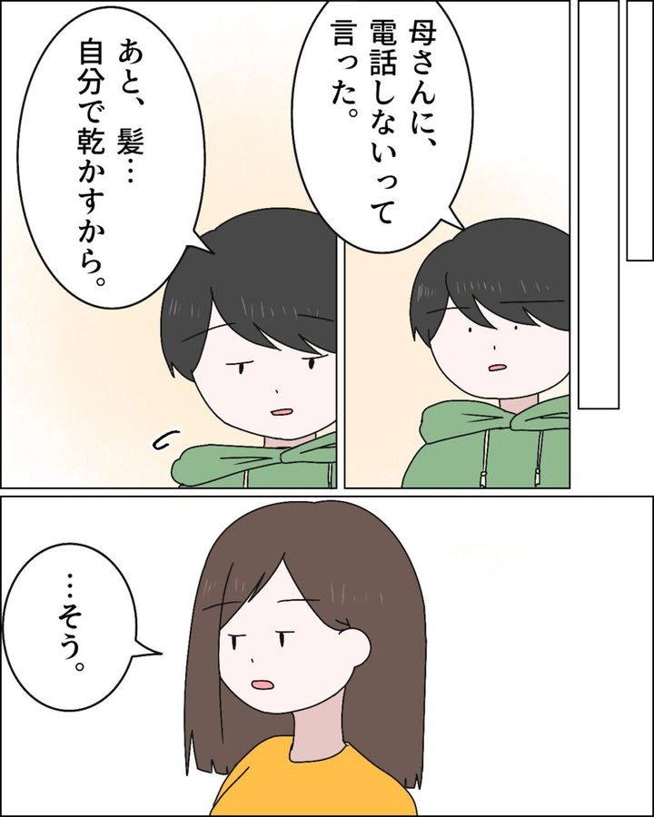 その後、「母さんに、電話しないって言った。あと、髪・・自分で乾かすから」マサオさんがそう言うと、「・・そう」ヨウコさんは静かに答えました。
