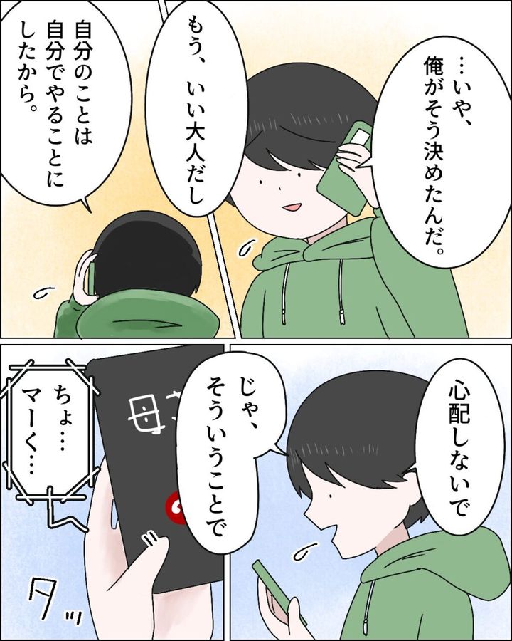 「・・いや、俺がそう決めたんだ。もう、いい大人だし、自分のことは自分でやることにしたから」そう言った後、「心配しないで。じゃ、そういうことで」と言い、「ちょ・・マーく・・」義母が話し始めてもさっさと電話を切りました。