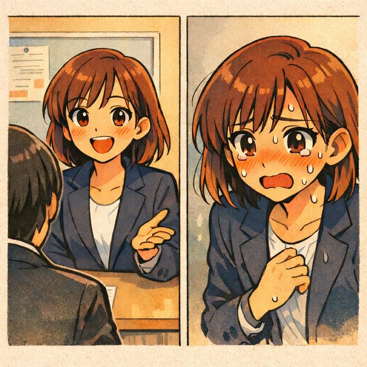 さっきまでの堂々とした態度はどこへやら、視線は泳ぎ、指先がかすかに震え始めています。