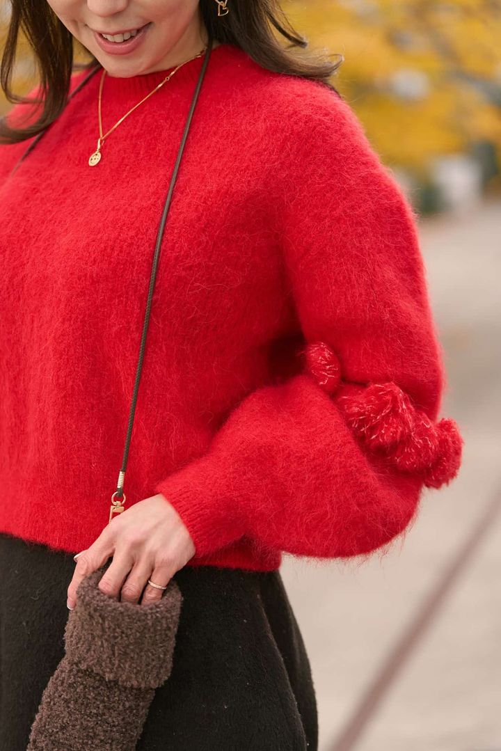 毎年必ず訪れる「ドレスコード赤」のイベントで着用できるニットを探している時に出会った赤ニット。クリアな赤色に袖の丸みやポンポンが可愛く一目惚れでした。あえて黒ではなく、チョコレートブラウン合わせで今年らしく。ミトンやバッグなどの小物をカラーをリンクさせて、コーデ全体にリズムをプラス。赤の華やかさを程よく引き算してくれる大人コーデに仕上げました。