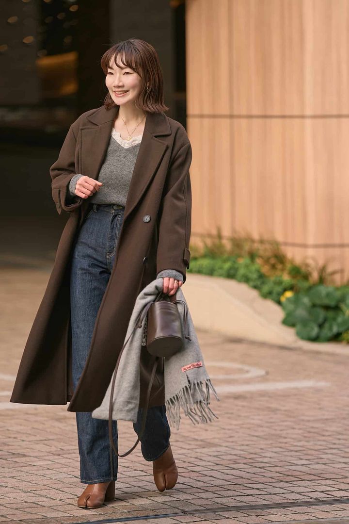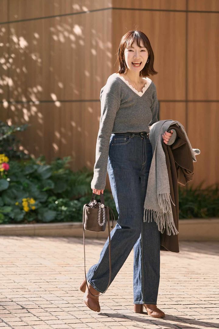 今年追加したニットは骨格ストレートの私でも、デコルテがきれいに映えるVネックでスッキリ見えが叶う理想の1枚です。さり気なく効いたフリルが程よいアクセントになって、冬のニットスタイルに華やぎを添えてくれるのも嬉しいポイント。インディゴカラーのデニムに足元はマルジェラの足袋ブーツでピリッと大人のエッジをプラスして、大人の甘辛バランスに仕上げました。