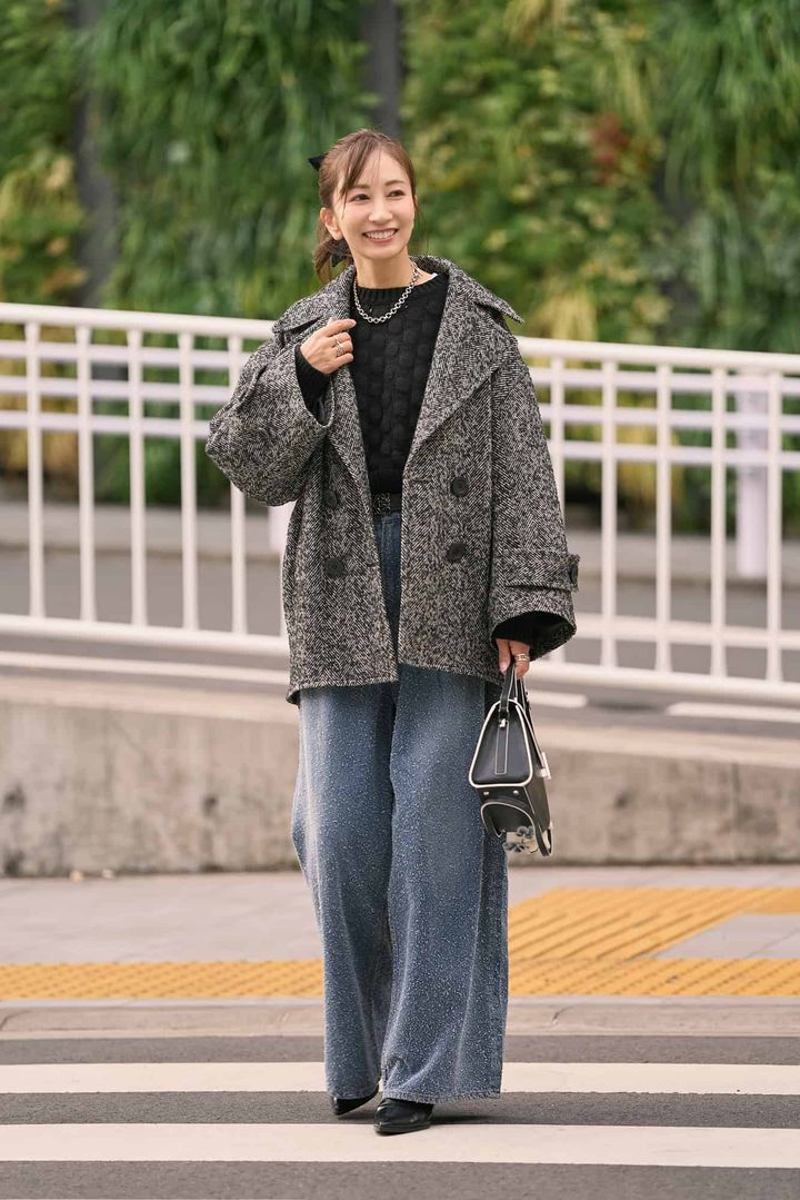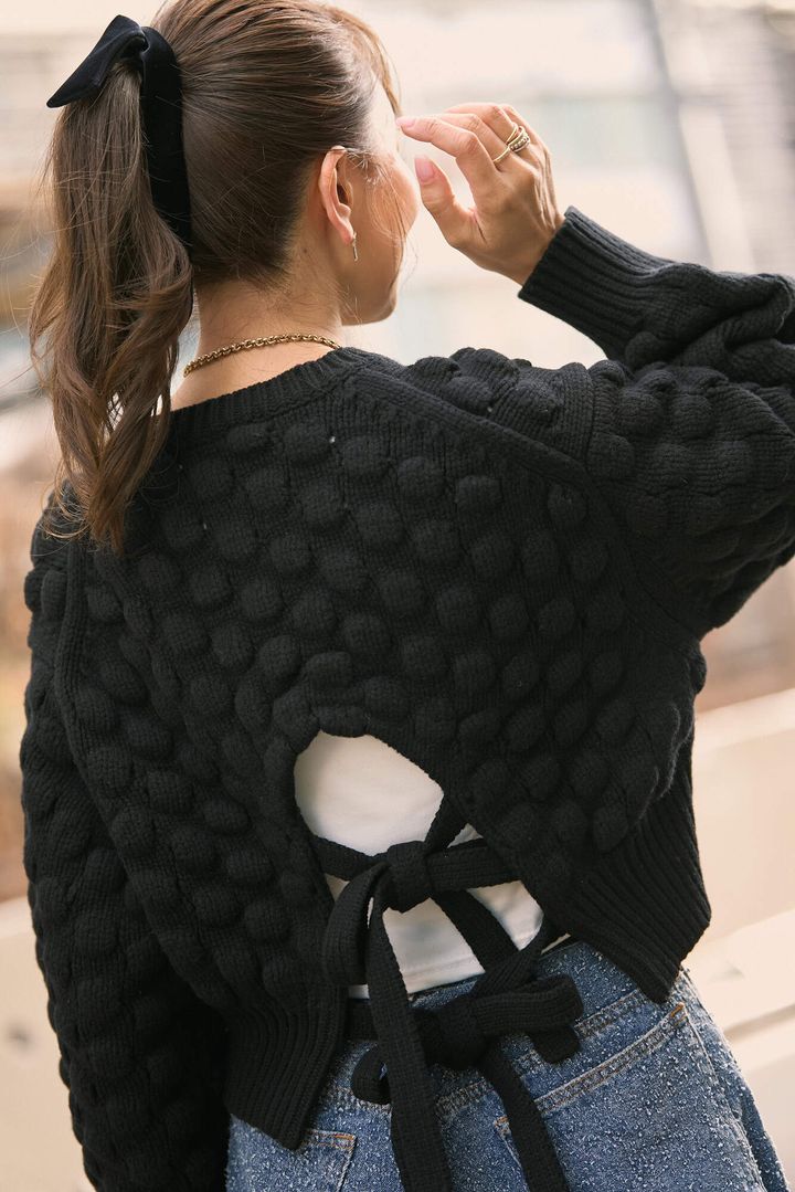 ぽこぽことした立体感ある生地と、目を惹くバックデザインに一目ぼれしたニット。シンプルなボトムスに合わせるだけでコーデが即決まり、短丈なのでボトムスも選ばずバランス良く決まるのが嬉しいポイントです。デニム合わせでカジュアルダウンして、足元はブーツ、バッグはかっちりしたものを選んで“大人仕様”に。ミックス地のコートを羽織ればシンプルでも表情のあるデイリーコーデが完成です。