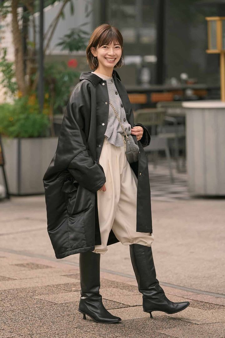 ベーシックカラーなのに1枚で存在感と華やかさがあるニットはセレクトショップで出会ったもの。しっかり暖かいのに、ニットではなかなか見かけないボリューム感がある袖のフリルが可愛くて一目惚れしました。今年は白のパンツをロングブーツにINして更新感を出して。ツヤ感あるロングコートを合わせてメリハリある大人のモノトーンコーデに仕上げました。