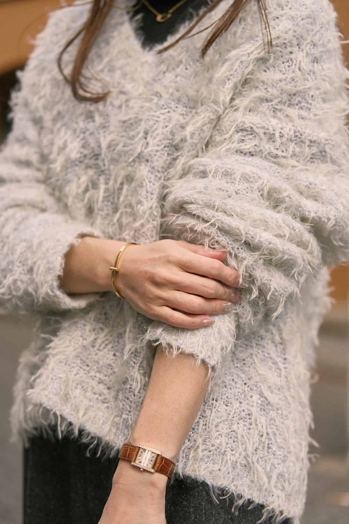 ダークトーンが増えがちな冬こそ顔まわりが明るくなる白ニットに惹かれます。ふんわりしたシャギーの素材感や上品なラメ、深すぎないVネックと大人にちょうど良い一枚です。タートルをINして防寒しつつコーデに奥行きをプラスして、ボトムスはマニッシュなワイドパンツで引き算コーデに。しっかり暖かいのでアウターは軽やかにポンチョでまとめました。