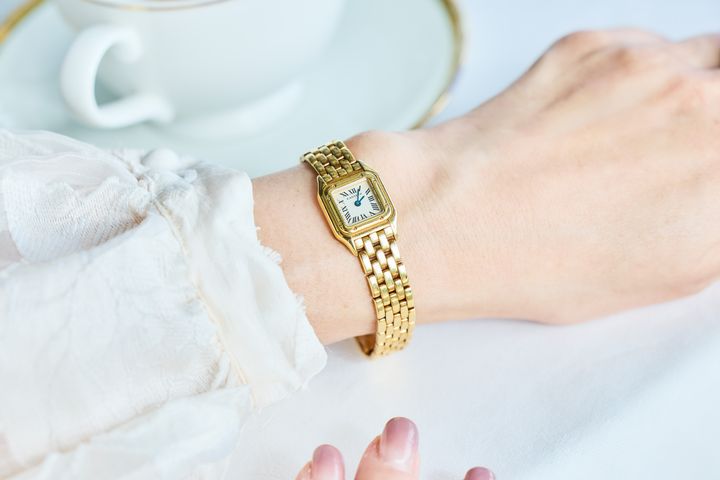 20代から憧れていた、金無垢のカルティエのパンテール ミニ。仕事が安定してきた30代後半に、思い切って購入しました。手元をキラッと輝かせてくれるため、時計というよりジュエリー感覚で身につけています。服装やバッグとの調和が取りやすいし、さりげないラグジュアリー感に秀でているので女子会にピッタリ。