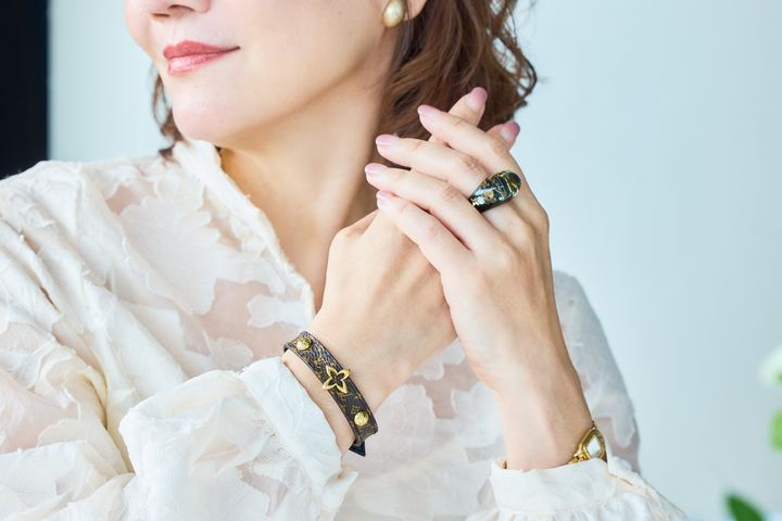 海外旅行先で見つけ、娘とお揃いで購入したルイ・ヴィトンのバングル。お馴染みのモノグラム柄ですが、アクセサリーだとさりげない感じですし、人とあまりかぶらないところも◎。身につけているとよく褒めてもらえますし、会話のきっかけにもなる頼もしい存在です。
