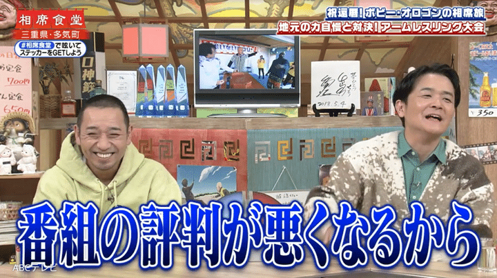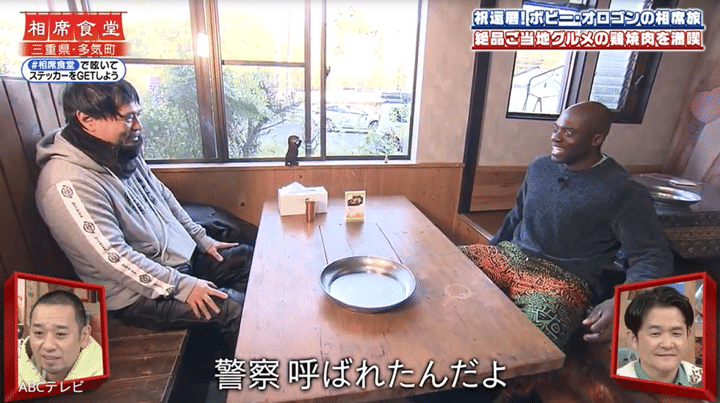 多気町は鶏焼肉が有名ということで、ボビーは町の有名会長から教えてもらった炭火焼肉店「きみや」へ。そこでボビーは常連客の年下男性に、「いいか、いいか。奥さんは辛いかもしれないけど、我慢しろ。俺は我慢できなかったからな」と年長者としてアドバイス。続けて「警察呼ばれたんだよ」と、活動自粛の原因である夫婦トラブルについて笑いながらサラッと触れ、常連客と千鳥を驚かせた。