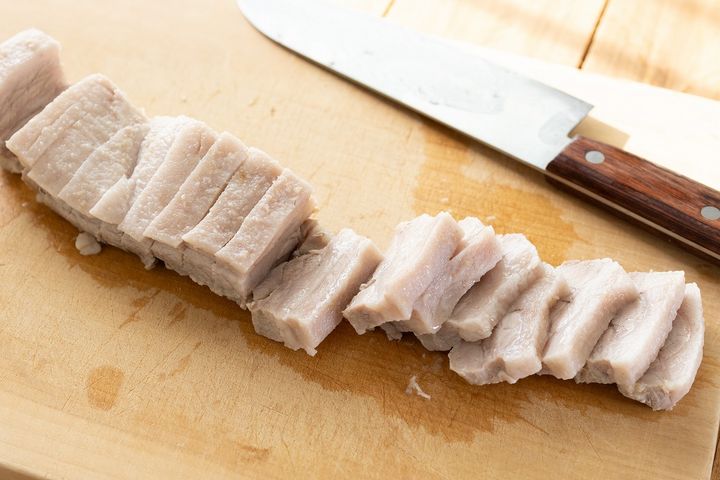 4. 粗熱が取れた豚肉を1cm幅に切り、サンチュ・キムチ・つけだれと一緒に盛り付け、包んで食べる。
