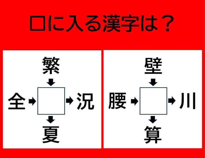 【漢字パズル】全□、繁□、□況、□夏 □に入る漢字は何…?