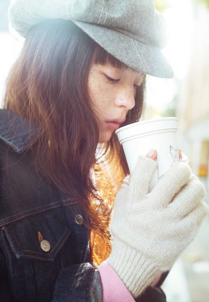 カフェ『Haus Kiru』でコーヒーをテイクアウトして街へ。軍手をモチーフにした〈テンベア〉の手袋は、起毛させたウール糸を使用し、軽くて暖かく優しい肌触り。親指と人さし指の指先が開いたデザインで、手袋を身に着けたままでもスマホなどの操作がしやすいのも魅力。手袋¥2,310(テンベア 03−3405−5278) デニムジャケット¥38,500(ヤエカ/ヤエカ アパートメント ストア 03−5708−5586) キャスケット¥12,100(エンジニアド ガーメンツ/ネペンテス ウーマン トウキョウ 03−5962−7721)スウェット¥71,500(WMV/ダブリュー エム ブイ ビズビム トウキョウ 03−6303−3717)