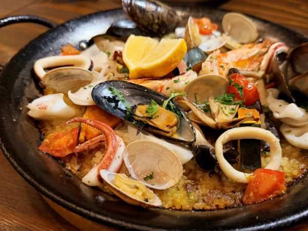 そして外せないのが、看板メニューの「魚介のパエリア」。一口食べると、魚介の出汁が芯まで染み込んだごはんの旨さに驚かされました。カリッと香ばしいおこげもたまらない存在感。大ぶりの魚介に加え、かぼちゃやれんこん、にんじん、きのこなど、季節の野菜がふんだんに使われていて、まさに旬を食べる一皿でした。