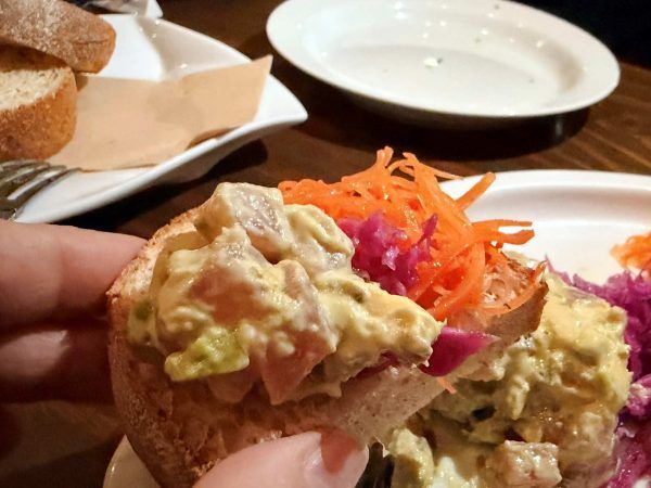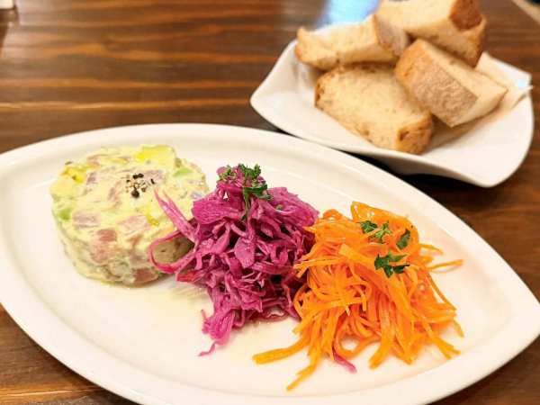 まずいただいたのは「鮪とアボカドのタルタル風サラダ」。マグロの濃厚な旨みとアボカドのクリーミーさが口の中でとろけ合う贅沢な味わい。ほんのり香るわさびが全体を引き締め、添えられたラぺとの相性も抜群。パンと一緒に楽しみたくなる完成度の高い一皿でした。最初の一皿から期待が一気に高まりました。