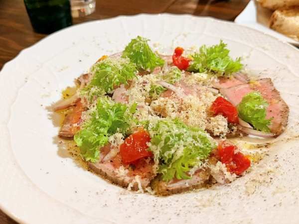 次は「ローストビーフのカルパッチョ」。しっとりと火入れされた赤身肉に、香味野菜と削りたてのコンテチーズがたっぷり。ふわっと広がるチーズの香りと、旨みが凝縮されたセミドライトマトの酸味が絶妙なアクセントでおいしい。