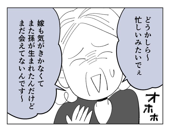 もうすぐ還暦のマリコさんは、市役所に勤める優秀な長男ユウトさんが自慢です。しかしその妻セリナさんは、ユウトさんと不釣り合い。若い頃やんちゃだったこともあり、マリコさんは偏見の目で見ています。そして2年前、とうとう大ゲンカに。そこからマリコさんは、孫の成長を写真でしか見ていないようです。