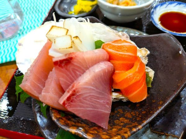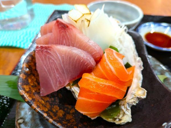 お造りが4種、サーモン・ブリ・びんちょうマグロ・炙りイカが2切れずつ入っています。