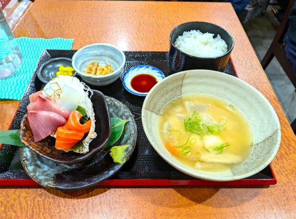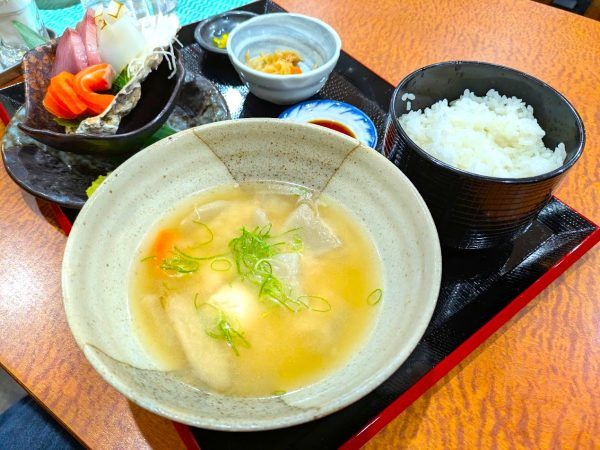 お造り4種とたっぷりの豚汁、炊き立てご飯の「お造りの定食」800円