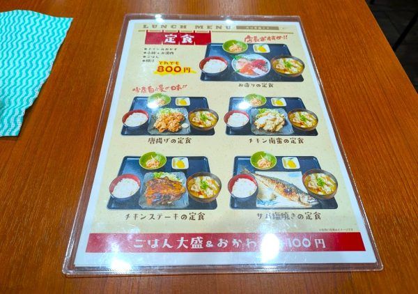 ランチメニューは、どれでも800円の定食で、お造りの定食・唐揚げのの定食・チキン南蛮の定食・チキンステーキの定食・サバの塩焼きの定食です。どれでも800円って、お手頃価格でお得ですね。日替わりランチは、お得な大サービスの定食で、880円ぐらいです。お得な大サービスって、きっと、内容が良いのでしょうね~。