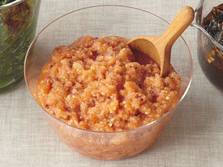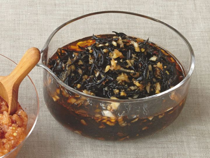 ひじきはさっと洗い、たっぷりの水に20~30分浸してもどし、水けをよくきる。密閉できる保存容器に入れ、ねぎ、しょうが、しょうゆ、酢、ごま油、豆板醤を加えて混ぜる。