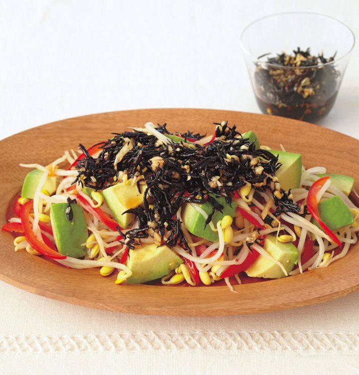 赤パプリカはへたと種を取り、縦に薄切りにする。豆もやしとともに熱湯で1分ほどゆで、水けをきる。アボカドは縦にぐるりと切り目を入れ、ひねって半分に分けて種を取り、皮をむいて1.5cm角に切る。器に盛り合わせ、「ひじきの中華風ドレッシング」をかける。