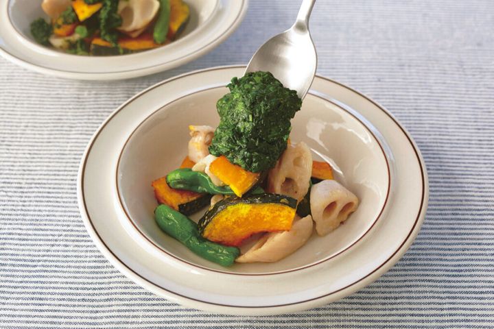 (2)フライパンにサラダ油を高さ1cmくらいまで入れて中温に熱し、れんこんとかぼちゃを5~6分揚げて油をきる。続けてしし唐を1分ほど揚げ、油をきる。器に盛り合わせ、「モロヘイヤのガーリックドレッシング」をかける。