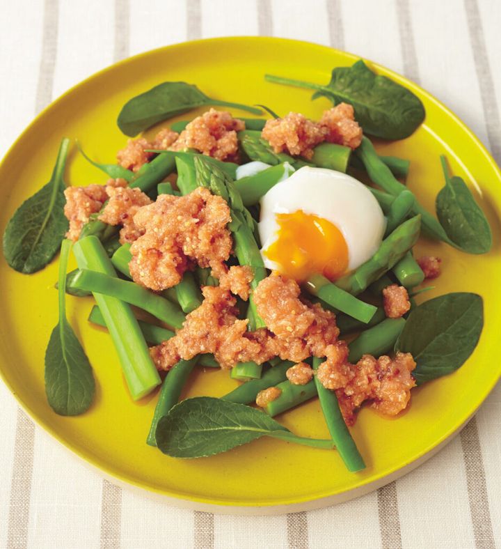 アスパラは根元の堅い部分を切り、下から3cmくらいの皮をピーラーでむき、長さ5cmに切る。いんげんはへたを切り、長さを半分に切る。合わせて熱湯で2分ほどゆで、水けをきって粗熱を取る。器に盛ってベビーリーフを散らし、温泉卵をのせて、「おからのイタリアンドレッシング」をかける。