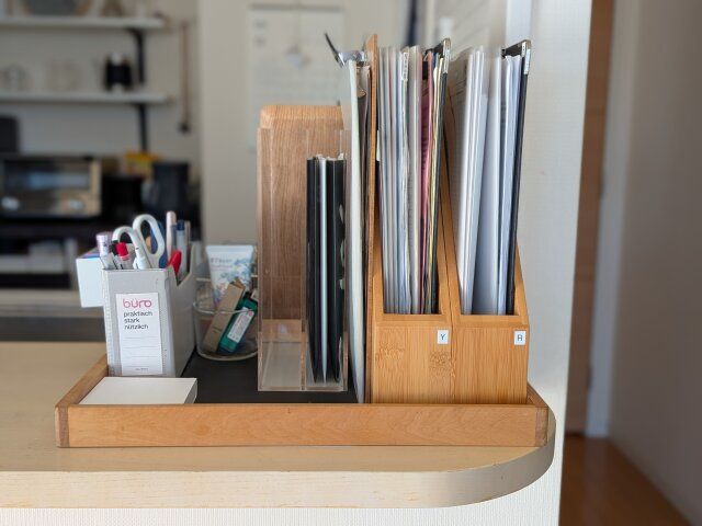 わが家では、キッチンカウンターの一角に筆記用具やハサミ、のり、印鑑などをまとめた“事務スペース”を設けています。
