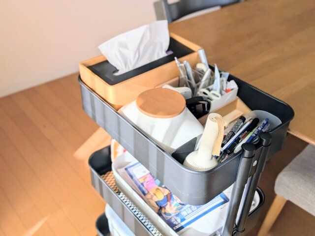 子どもたちが座る場所の近くに、ダイニングテーブルでよく使うものをまとめて収納できるワゴンを置いています。