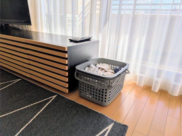 そこで、“ただ入れるだけ”のシンプルな洗濯かごをリビングに置いてみることに。すると、脱ぎっぱなしはぐんと減り(息子は声かけが必要な日もありますが…)、リビングが散らかりにくくなりました。