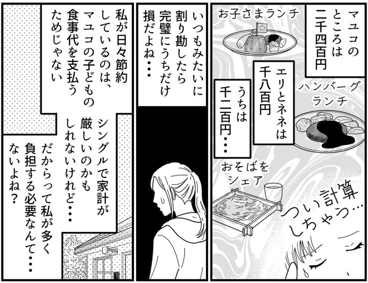 その日、私たちは子連れランチをしました。マユコのところは2人分を注文、エリとネネは大人の分にお子さまランチを追加、うちはまだ子どもが小さいから1人分を頼んでシェア。私は頭のなかでつい細かく計算してしまいます。