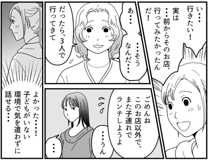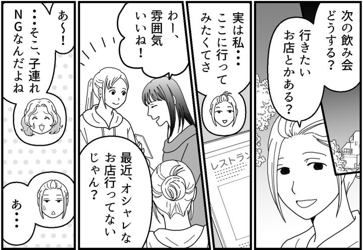 ネネがSNSで見つけてくれたお店は、美味しい創作料理が楽しめるオシャレな雰囲気のお店でした。しかもマユコによると子連れNGなのだそう。私が飲みに行きたいのは、本当はそういうお店なんです。大人だけで気兼ねなくお酒を楽しめるような……。私が思い切って「行きたい!」と声をあげると、次の飲み会はマユコ抜きの3人で行く流れになりました。