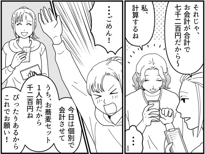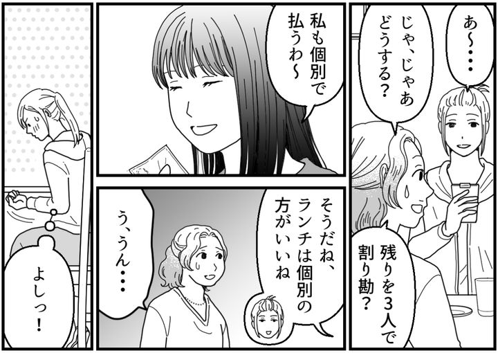 勇気を出してみたら割り勘が無事に阻止できたし、大人だけでの飲み会も実現できそうです。マユコの寂しそうな顔は見て見ぬふりをしました。これで……良かったんですよね?