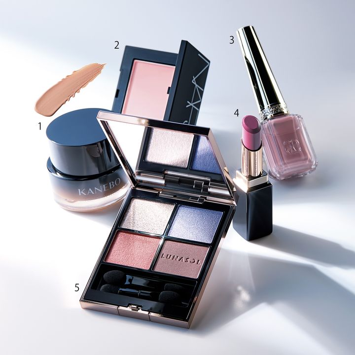 1.光を巧みに操り、気になる部分をシームレスにカバーするクリームファンデーション。生命感あふれる艶やかな肌へ。カネボウ ライブリースキン ウェアⅡ SPF4/PA+ ¥12,100() 2.天然由来のピグメントがさりげない血色を与える。骨格を美しく引き立てるマットピーチ。NARS ブラッシュ N 927 ¥5,060() 3.ひと塗りでもしっかり発色。スモーキーなピンクでしなやかな指先を演出して。エレガンス ネイルカラー 06 ¥3,850() 4.むっちりとボリューム感のある唇を叶える。ミルキーなパープルでほんのりモードな風をプラス。モイスチャー グレイズ リップ スティック 13 ケースとセット¥5,830() 5.【KEY ITEM】異なるカラー&輝きがまぶたの上で混ざり合うと、下垂した大人の目元にも透明感のある奥行きが。まばゆい煌めきを重ねると一気に華やぐ。ルナソル アイカラーレーション N EX12 ¥7,700()※11/21数量限定発売