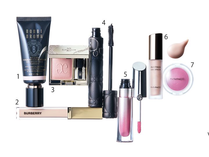 1.くすみや毛穴をぼかし、ワントーン明るい素肌美を実現。インテンシブ セラム ラディアンス プライマー SPF24/PA++ ロージー 40ml ¥7,370() 2.高密着でハイカバー。気になる肌悩みをなかったことに。バーバリー ビヨンド ウェア パーフェクティング コンシーラー ¥5,500(バーバリー ビューティ) 3.優しい血色と立体感をもたらすパーリーなレッドブラウン。エレガンス プレジール アイズ 06 ¥3,850() 4.なんとボリュームを440%もアップ! 漆黒のピグメントが目力を強める。マスカラ ディオールショウ オーバーボリューム 090 ¥5,610() 5.唇の凹凸を埋め、アイシーな輝きとボリュームをもたらす。プリズム グラス アイシー プランパー 34 ¥6,600() 6.【KEY ITEM】セラム級の潤いでみずみずしいツヤとハリをもたらす。スキンフィニッシュ ライトストラック リキッド ハイライター ライトスカペード ¥5,500() 7.【KEY ITEM】内側から染め上げるおもちのようなテクスチャー。透明感を引き出す青みピンクをセレクト。グロー プレイ クッショニー ブラッシュ トータリーシンクト ¥4,950()