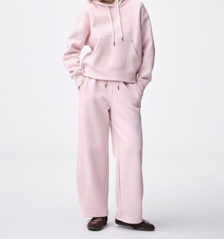 カラー展開も、洗練されたグレーやブラックのほか、柔らかなピンクやナチュラルなど、大人の肌を明るい印象に見せてくれるラインナップ。おすすめは、同素材のフーディと合わせたセットアップスタイルです。