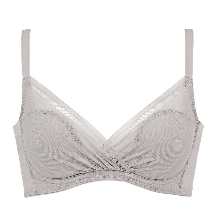 「L字型ワイヤーは、締め付け感が苦手な方に向けた『ソフト補整ブラ』をコンセプトにした商品に採用しています。前中心が低く、圧迫感なく着用できるのが魅力です。そこに、パワーネット素材のセンターパネルを組み合わせることで、バストの横広がりを防ぎ、美シルエットに導きます」 (デザイナー/高岡悦子さん)