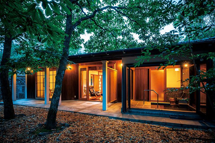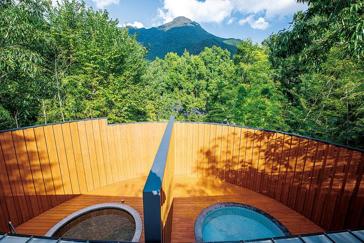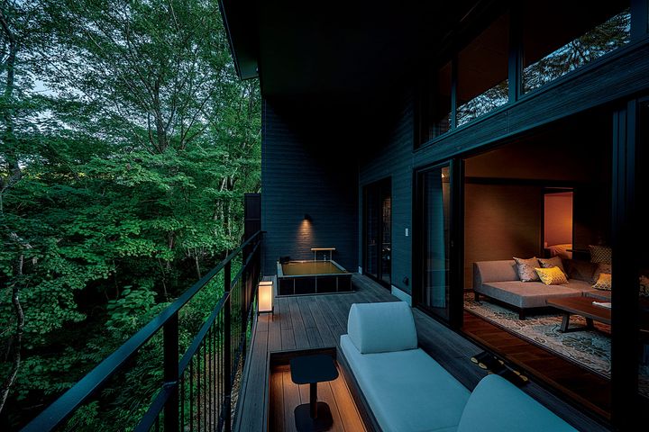 (写真)森と湯川に面した客室のテラスには、ガーデンソファと露天風呂。「御用邸」をテーマにしつらえられた室内は、何もしない贅沢を味わうにふさわしい空間。